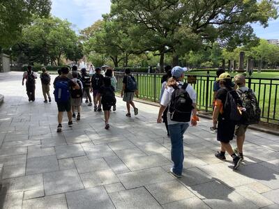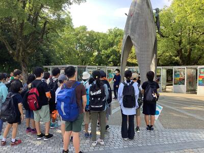 平和集会で折り鶴を貞子さんの像に捧げた後は、班ごとに石碑巡りを行いました。