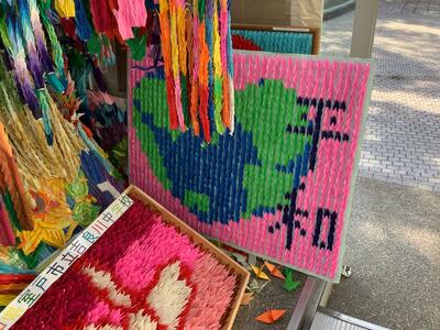 1学期に全校生に折ってもらった折り鶴を一枚の絵にしているところです。完成までもう少しです。