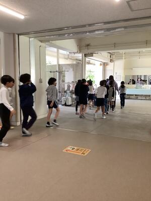 避難訓練を行いました。放送後に素早く動き、校舎の外に出ると急いで集合。