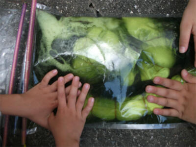 Tシャツを糸で絞った後、藍の溶液に入れました。色が黄色~黄緑です。タクアンみたいとか野沢菜漬けみたいとか言いながら、押し揉みをします。十分にできたら、水にさらして溶液を洗います。ここで劇的に色が変わります。空気に触れるそうですが、とても不思議です。きれいな藍色になりました。完成間近です。