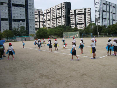 1年が運動場でしっぽ取りゲームをしていました。素早く動き、自分のしっぽを守りつつ、人のしっぽを取ります。これがなかなか難しいようです。