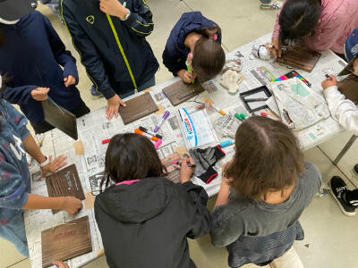 丹波少年自然の家に到着しました。雨天後の状態と山蛭がいるため、森の小屋づくりから焼き板細工に変更し、ブラシと新聞紙で板を磨いています。お家に持って帰ります。