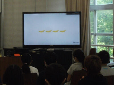4年が外国語活動で楽しく歌っていました。「バナナじゃなくってBanana!」 英語では『ばな~な~』のような感じで発音するので、正しい発音を聞いて、声に出そうという楽しい練習用の歌です。手拍子もしながら、リズムに合わせて歌っていました。