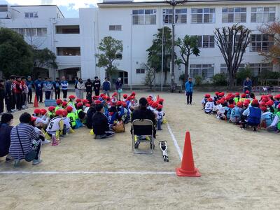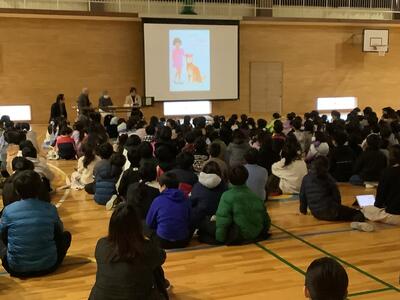 1年生から6年生まで真剣な表情で話を聞いていました。