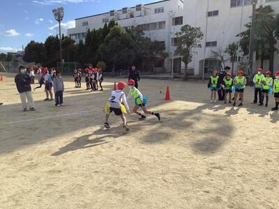 潮見小学校5年生に浜風小学校まで来ていただき、浜風小学校の5年生とスポーツ交流会を行いました。フラッグフットボール協会や大学のアメリカンフットボール部のお兄さんお姉さんに教えていただきながら、フラッグフットにつながるいろいろなゲームを楽しみました。