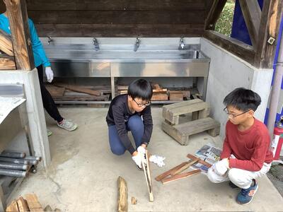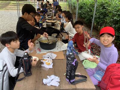 他のグループと食べ比べする班もいて自分たちで作ったカレーを堪能しました。もちろんスプーンは前日作ったスプーンを使い美味しそうに食べていました。